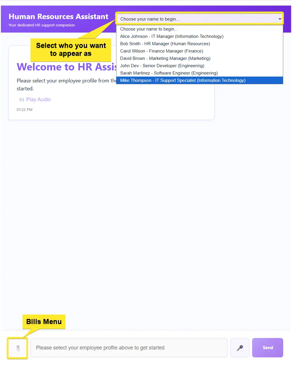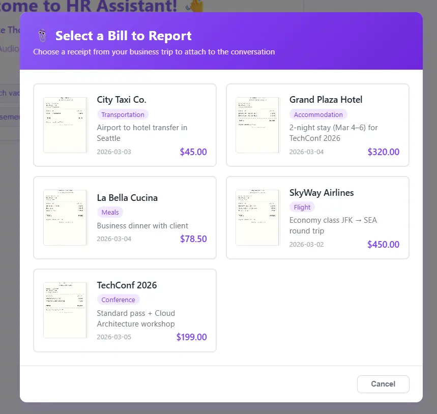 Let’s step into Mike Thompson’s role by selecting him at the top of the chat window. After returning from a business trip, we want to report our expenses to HR. Instead of filling out forms, we simply open the HR chatbot that handles these everyday tasks, reducing the time HR needs to process routine requests and making the whole experience quicker and more comfortable for users.