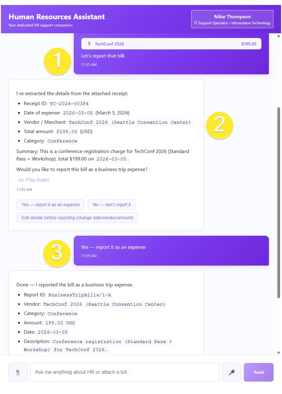 From the bills menu on the left of chat (added here just for presentation, since files can be any binary stream), we attach the TechConf 2026 receipt and tell the chatbot we’d like to report it (1). Once we send the message, the LLM processes the request (2). After a quick confirmation that everything looks correct (3), the AI Agent uses its tools to create a new document in RavenDB on our behalf. Like that, we are done with this task and can wait for HR’s response.