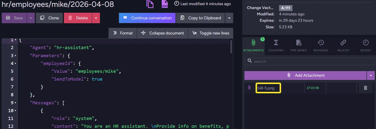 Now that our agent has accepted the file, we can enter RavenDB and take a look at the conversation collection to check how RavenDB handled things in the background. We can notice that RavenDB stored the file as a RavenDB document attachment to the conversation.