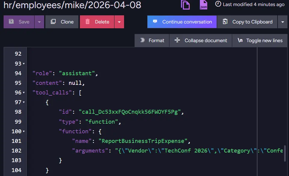 Until the conversation expires (the default expiration for this demo is 30 days), RavenDB can revisit this file and provide context to the Agent. Thanks to another tool, RavenDB also stores data from files and creates new documents, making data easier to access.