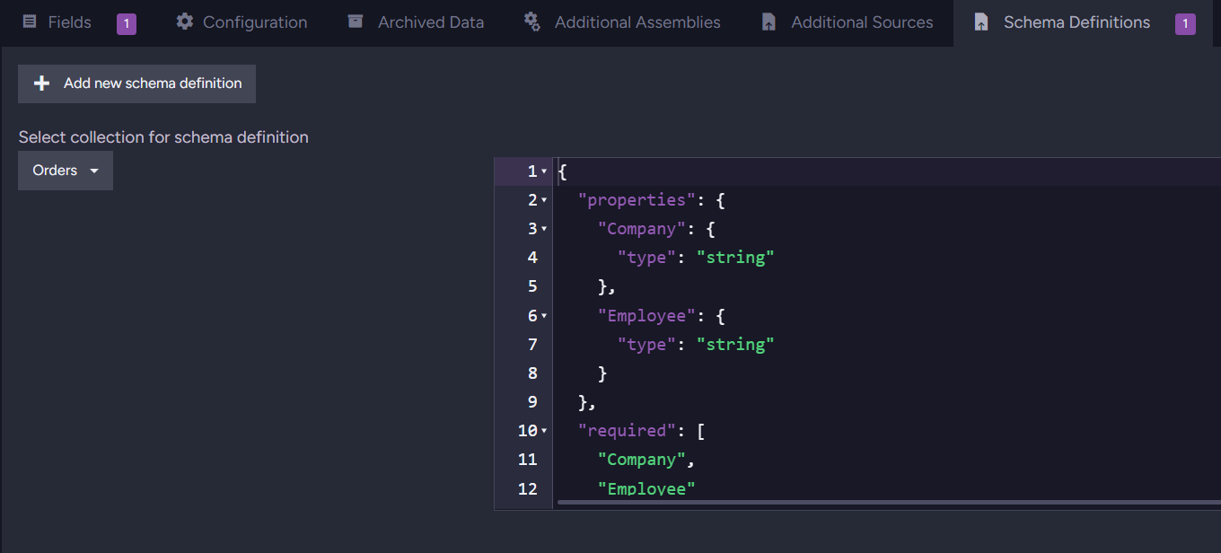 After you selected collection, you can proceed to write your schema. Schemas are built using JSON Schema, a popular vocabulary for JSON files. Basic schema on orders collection can look like this: