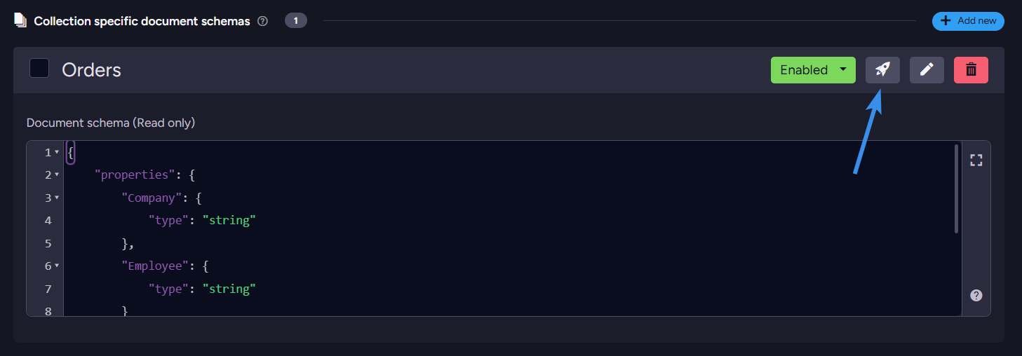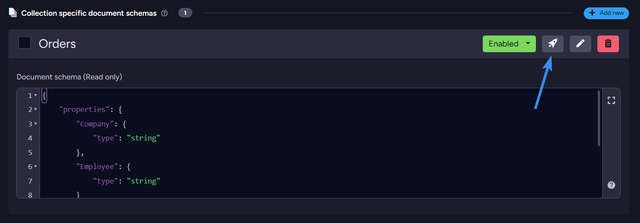 After you selected collection, you can proceed to write your schema. Schemas are built using JSON Schema, a popular vocabulary for JSON files. Basic schema on orders collection can look like this:
