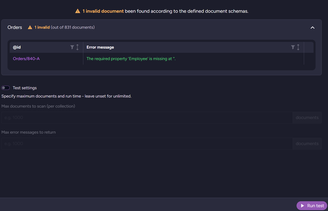 If you want to input only a few documents or use schema validation as a one-time scan, you can disable schema validation while leaving global schema validation enabled. You can also trigger a collection-wide scan to test all documents, not just new ones. We will use a basic schema to scan if all our Orders have the Company and Employee fields. Click on the testing button and then on the bottom-right corner, press run test. It will return all errors in the table.