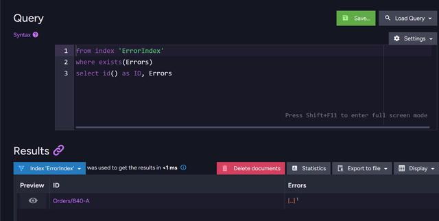 We can do that using our existing schemas. If you skipped creating a schema, you can look above or use the code. Let’s create an index that will capture errors. The index itself is easy.
