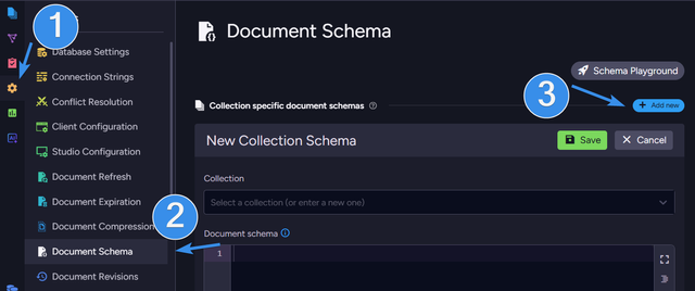 To configure schema validation in Studio, first enter the database you want to set it for, then navigate to Settings > Document Schema. Add a new schema. This gives us two fields. One to select the collection and another to write our schema in.