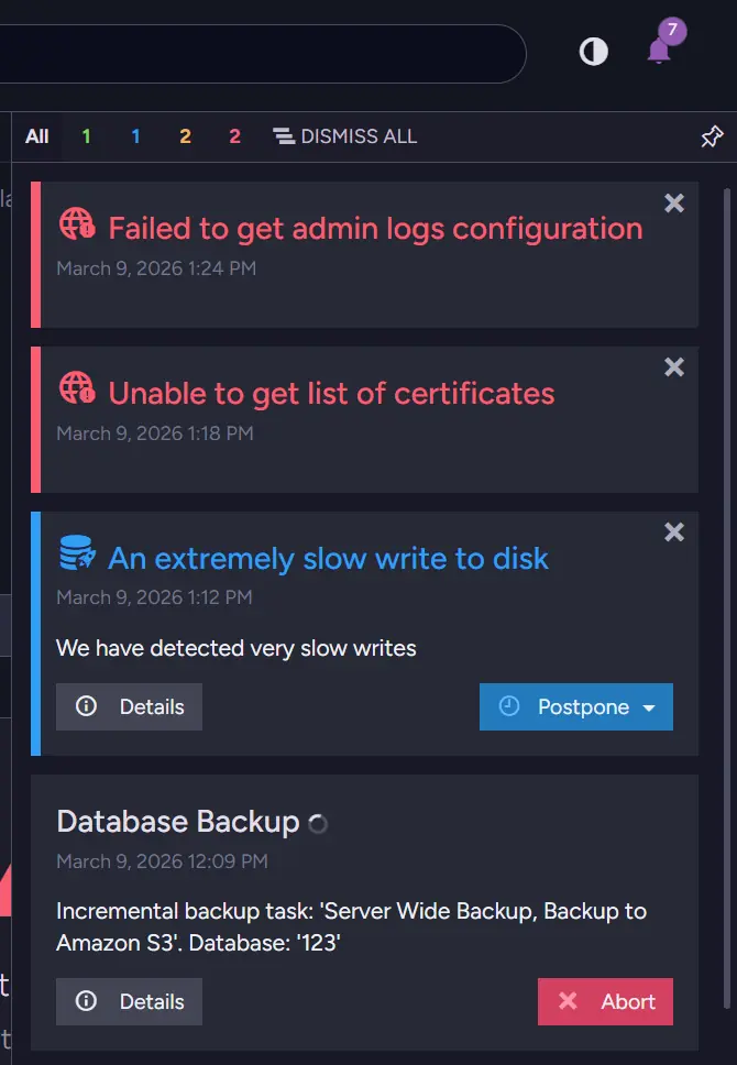 A good first step is checking whether RavenDB has already detected a known problem. Some issues, such as failing ETL processes, replication errors, or low disk space, are important enough that the server automatically raises warnings.