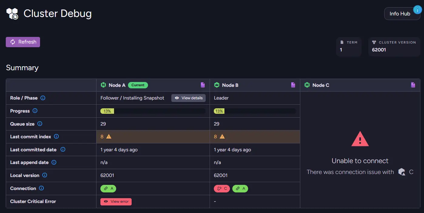 Cluster Debug exposes internal information about the cluster's state and Raft command queue. It can help identify nodes that are behind or situations where cluster commands are stuck. For example, if you post many commands at once, such as inserting files with operations, you can cause desynchronisation between nodes.