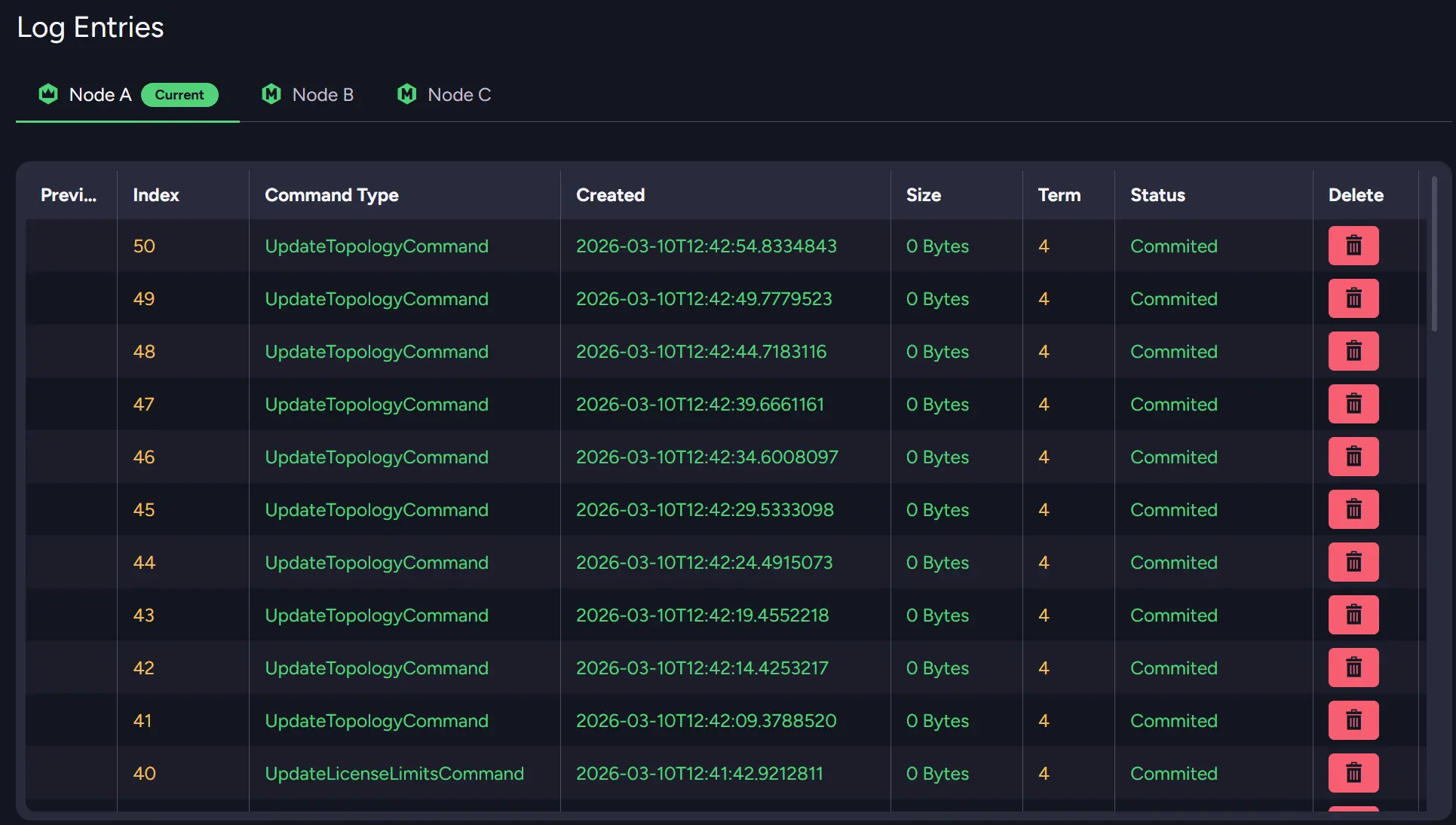 You can also see the queue size for each node to see if it’s desynchronized or see the status of your nodes. Scrolling down, you can also see the whole log entry for Raft operations that happen on each node.