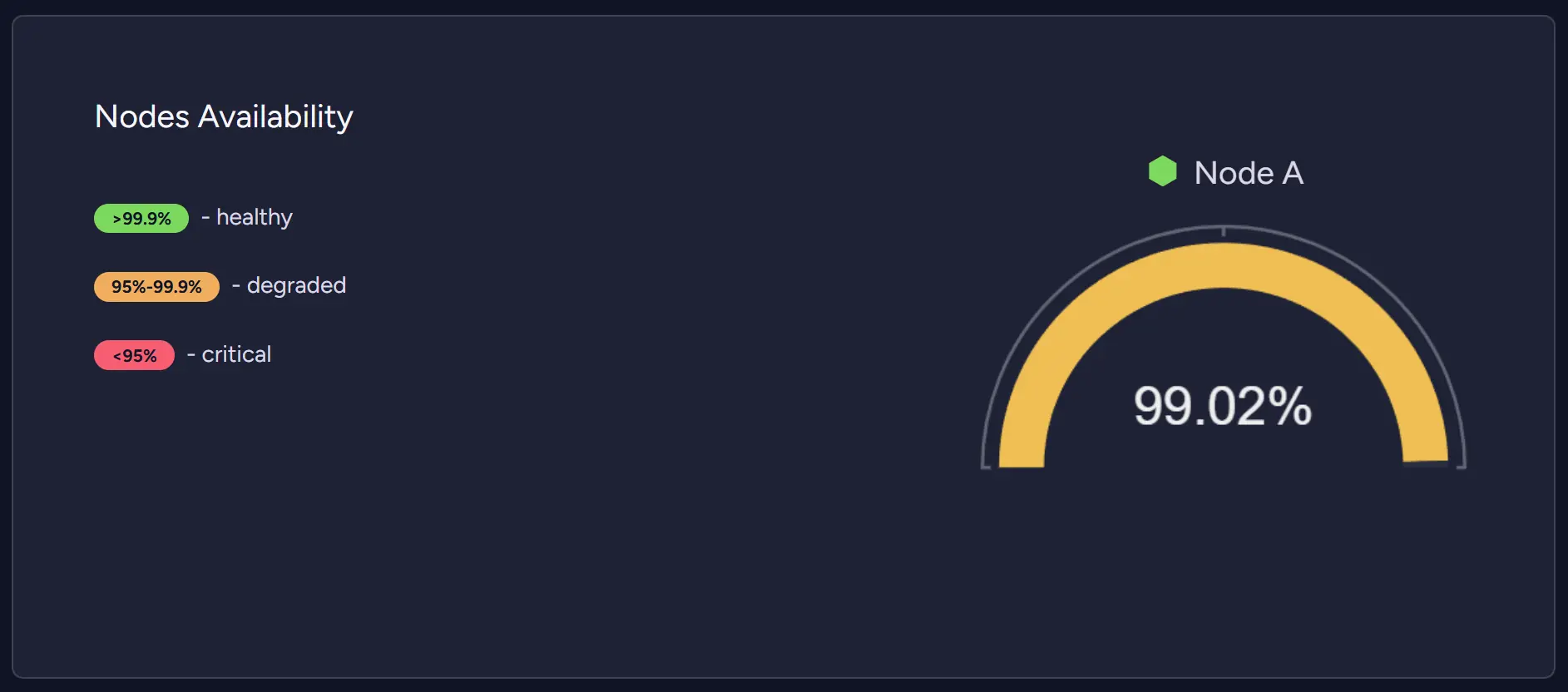 The first part of RavenDB Cloud monitoring is the Metrics and Cluster Health screens. The first metric you might look at to notice a problem is Nodes Availability widget. It is placed on the Cluster Health screen and provides overall information about whether something is wrong. If it is degraded, it’s a first alarm to look deeper into the system.