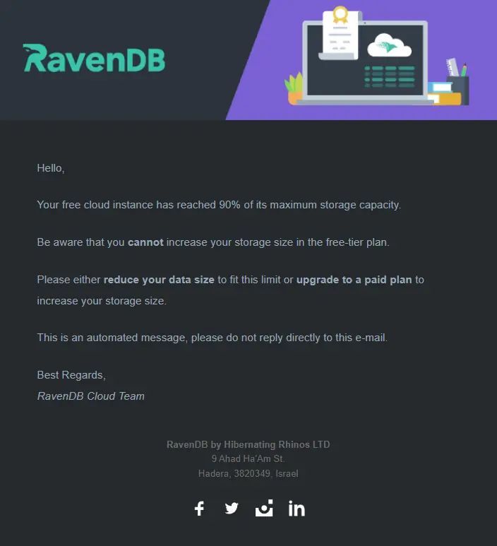 Additionally, if the database is struggling and, for example, our problems will start to fill our instance with data, or it will auto scale, we will get a notification via email connected to this database.