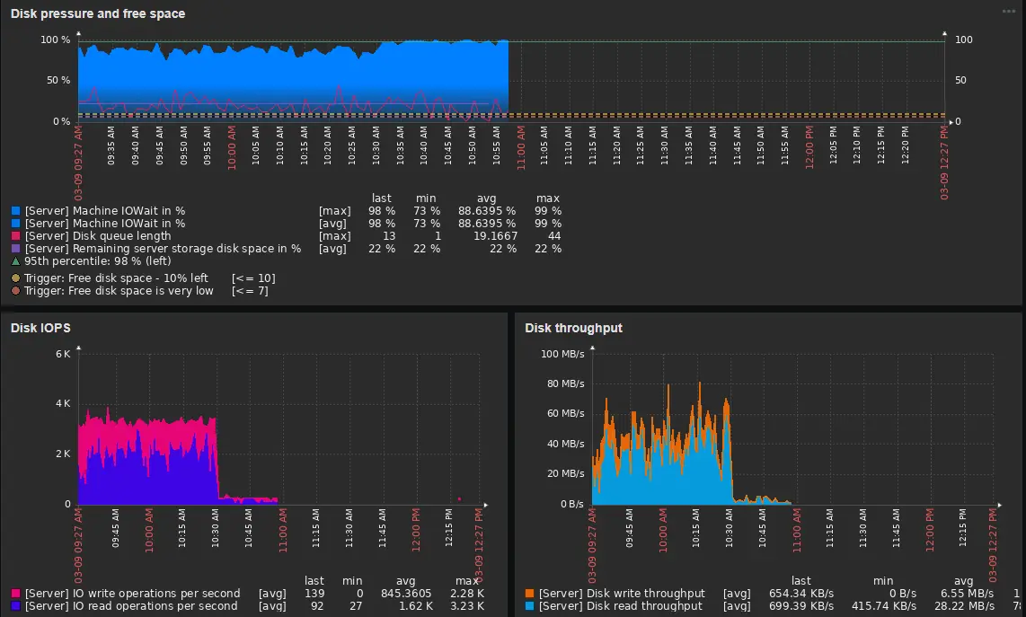 In our case, the disk is under the most pressure. Now we have a lead, and we can go to the database and use previous tools to identify the cause. More about monitoring can be found in the articles we mentioned.