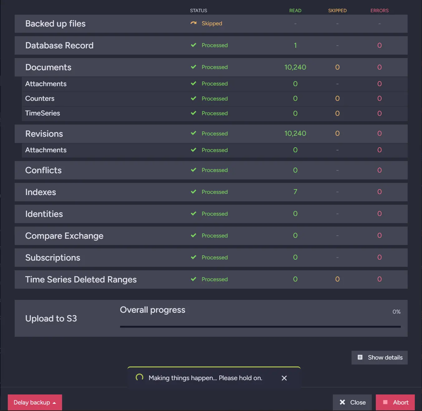 Here we can see that the backup file upload is stuck. From here, we can investigate further, gather information for support, or potentially resolve the problem ourselves. Let’s look at the dashboard and check our resources.