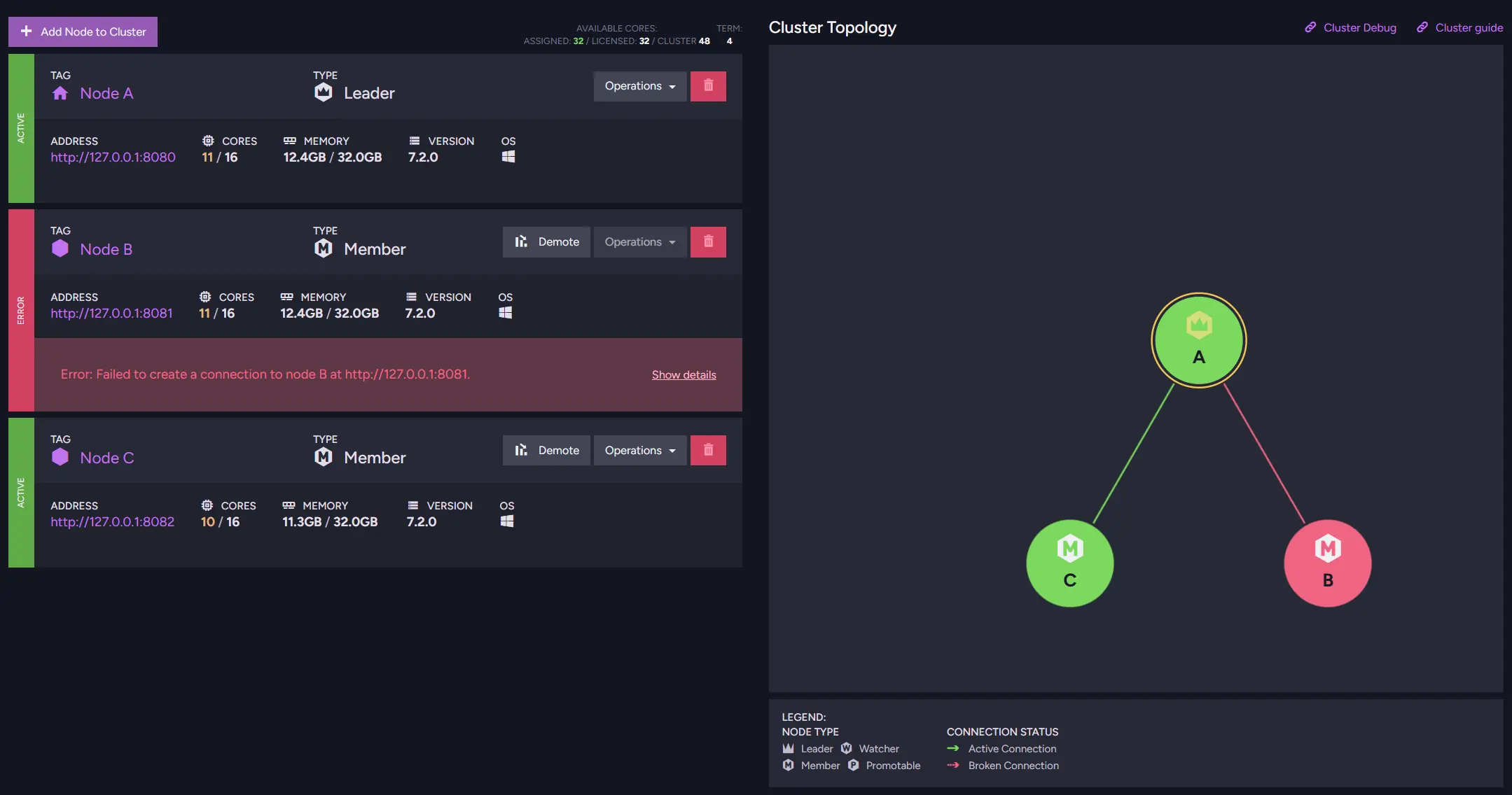 The Cluster Status view (link to documentation) helps you inspect the health of individual nodes and their topology. It shows how nodes relate to each other and whether any of them are unavailable or experiencing problems. By reviewing this view, you can quickly notice situations where a node is down or under heavy memory pressure.