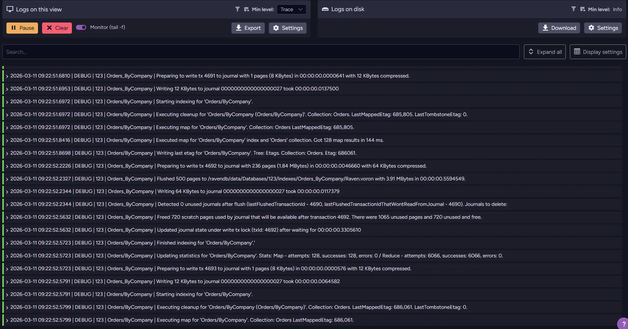 In addition to performance-related information, the logs can reveal errors, warnings, or unexpected behavior that might not immediately appear in the UI. This makes them especially problematic when you don’t know exactly what happened in the database that caused the issue. It is also a useful tool if you need to check later what led to problems, as you can download your logs to the disk after setup.