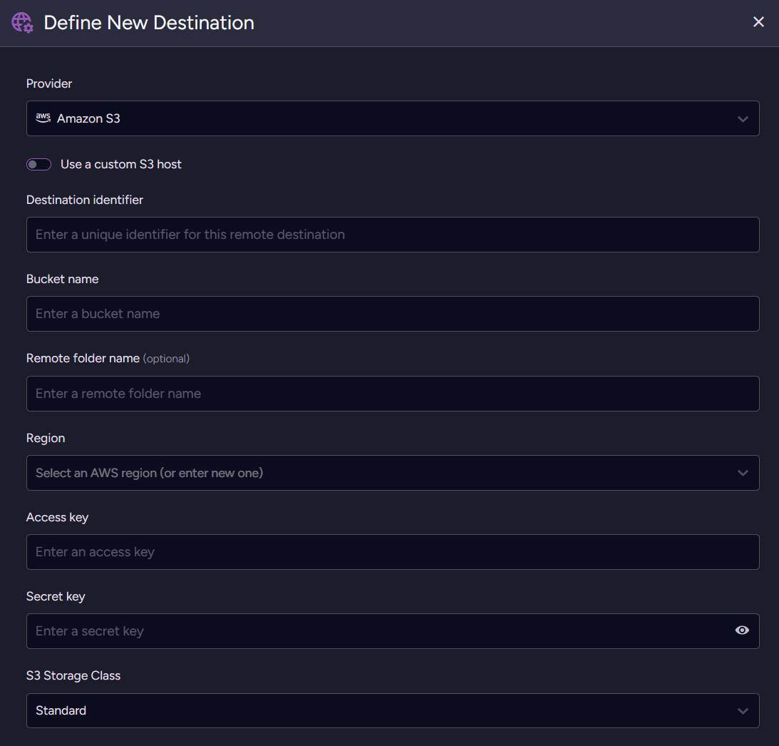 Configuration is straightforward. Pick the provider and enter a Destination identifier (your new Destination's unique name). Then we can go to AWS S3 and grab the needed information for the connection. First, enter the bucket you selected when creating S3, then select the remote folder (if needed) and the region that you can check on top right. Then go into IAM and create/enter your role with access key and secret key.