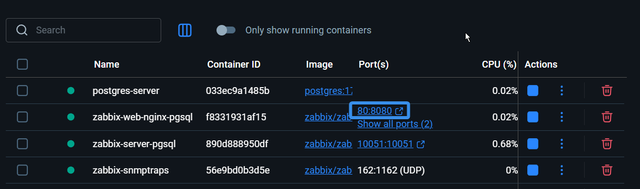 Let’s first log in to Zabbix with default credentials. You can enter webUI clicking at port next to the web container or by searching http://localhost:80.